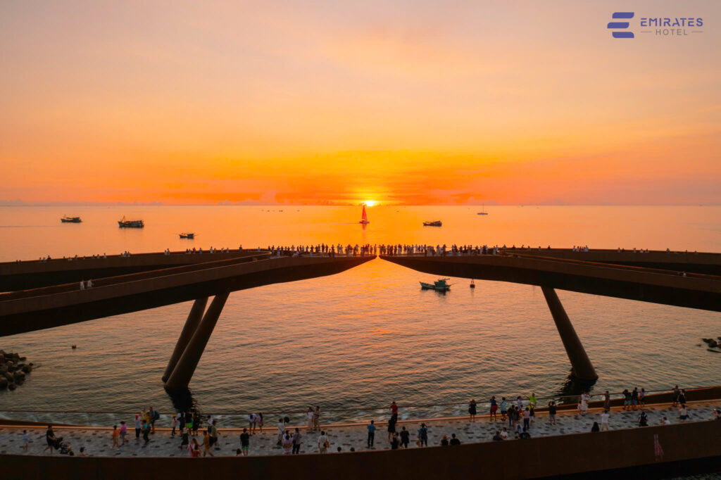 Tham quan check-in Cầu Hôn: Cầu Hôn là công trình biểu tượng mới của Sunset Town, nổi bật với vị trí nằm ở hướng chính Tây bờ biển và lối kiến trúc độc nhất vô nhị. Đến Cầu Hôn, bạn sẽ được ngắm trọn vẹn hoàng hôn ở vị trí đẹp nhất Phú Quốc, đồng thời sở hữu ngay những bức hình check-in độc nhất ở giữa 2 mũi cầu với một nụ hôn nồng nàn, một cái ôm thắm thiết hay một cái bắt tay chân tình.